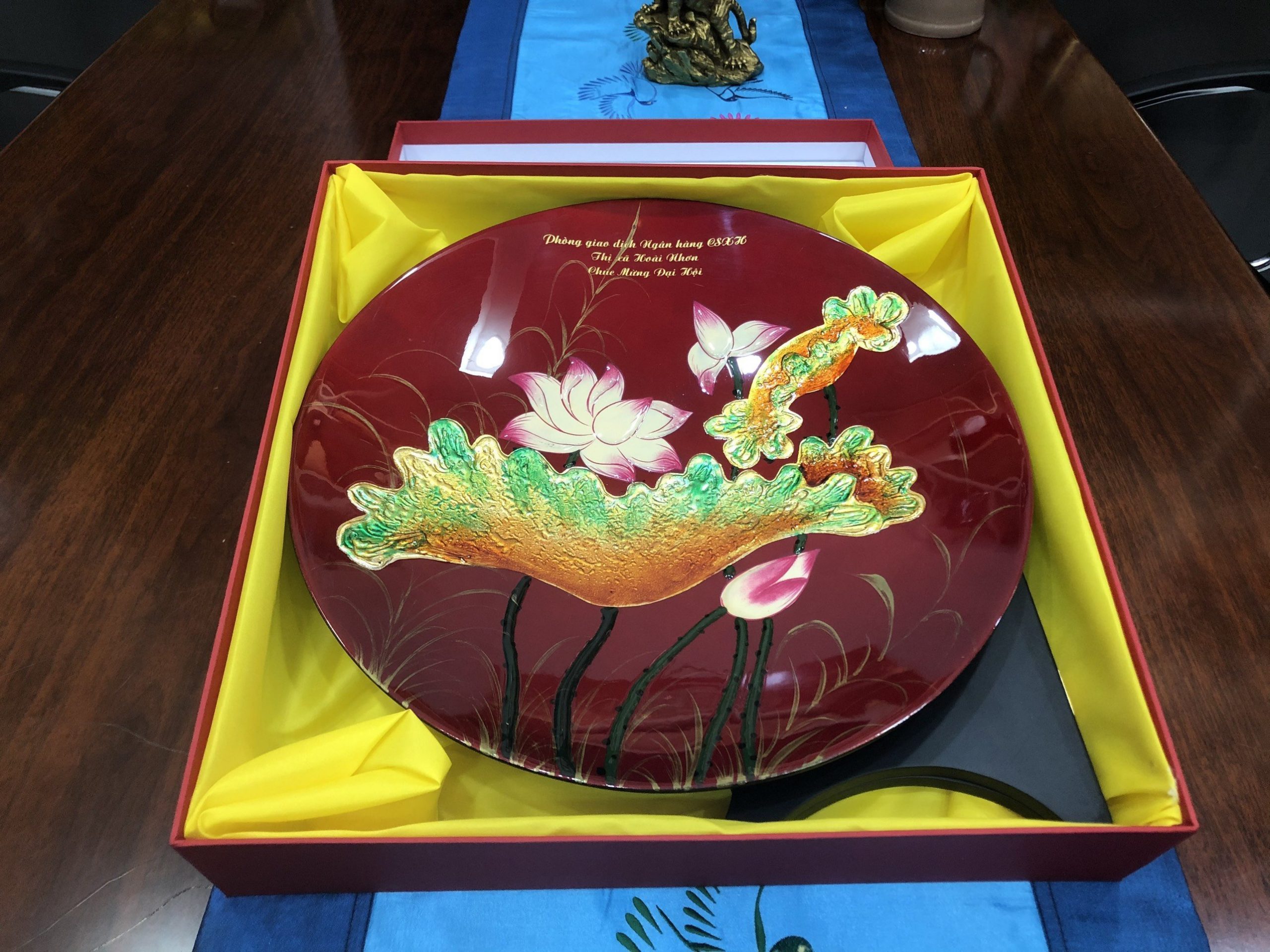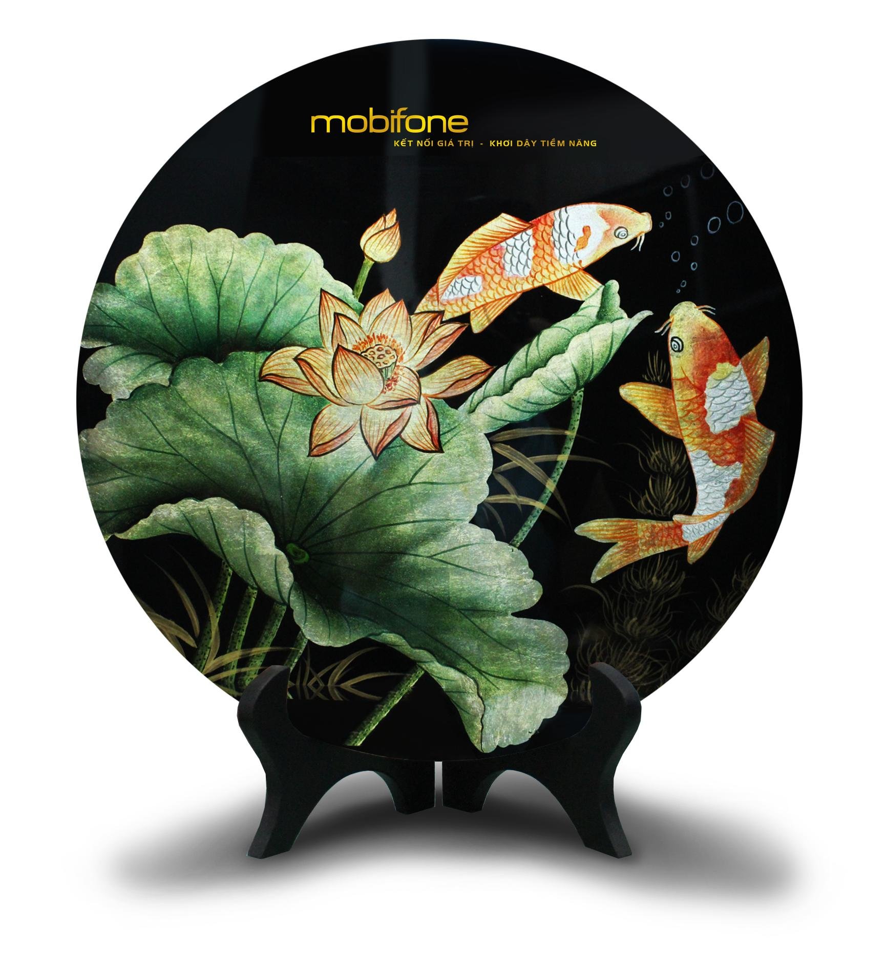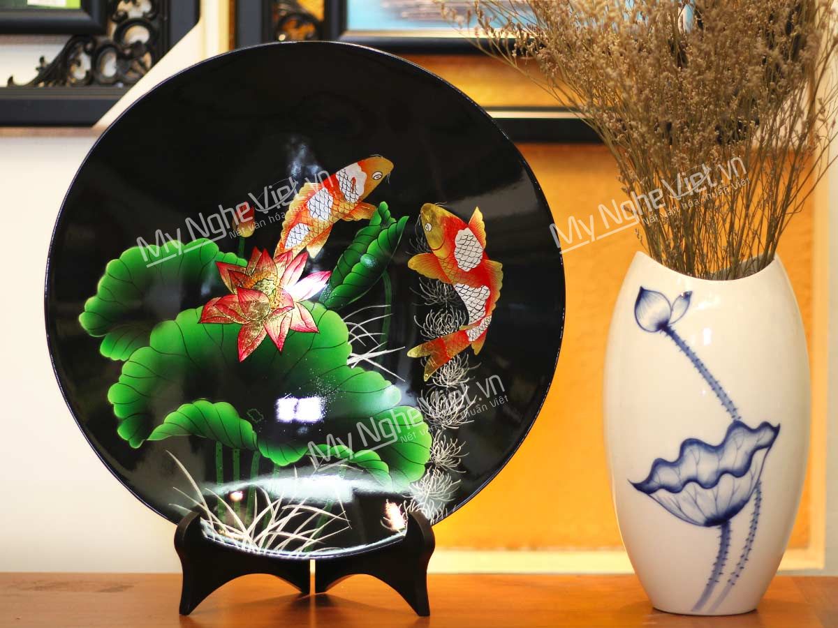 Tranh đĩa sơn mài cá sen khắc logo thương hiệu