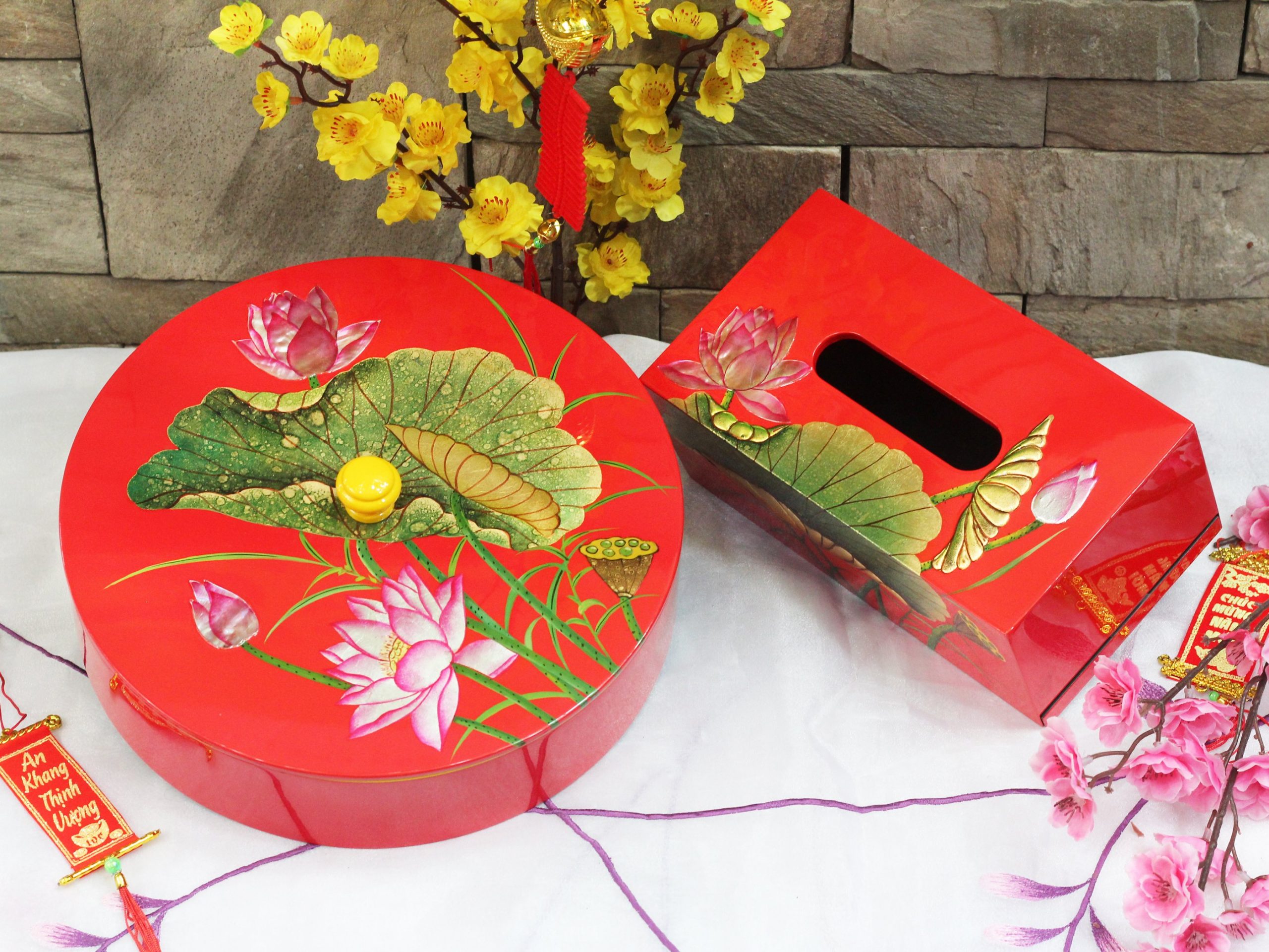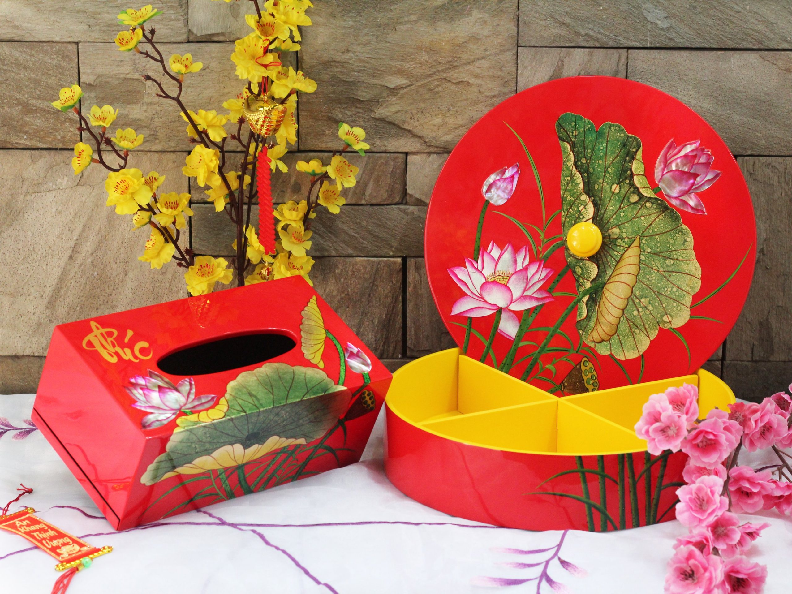Hộp mứt và hộp khăn giấy trang trí bàn trà tết