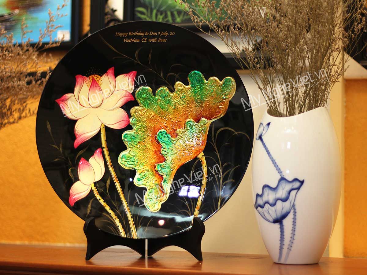 Tranh đĩa sơn mài hoa sen khắc lời chúc theo yêu cầu