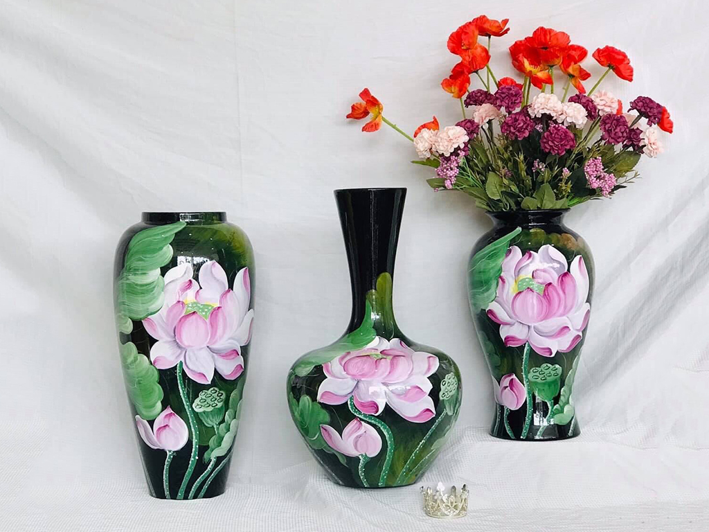 Bộ 3 lọ hoa sơn mài decor vẽ hoa sen hồng
