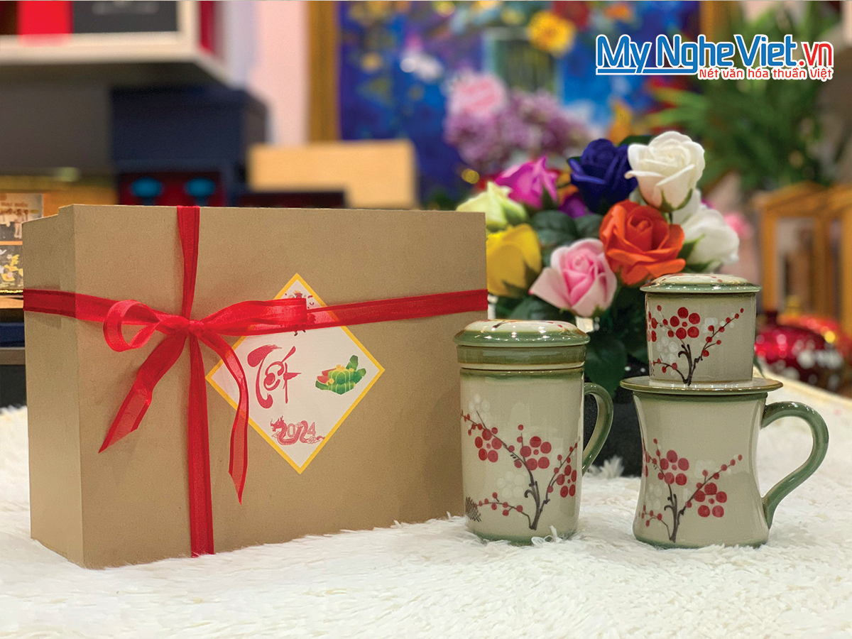 Sự kết hợp bộ 3 món quà tặng xinh xinh- in ấn logo thương hiệu trên sản phẩm gốm, đảm bảo không bị bong tróc theo thời gian. Hoa văn được vẽ tay thủ công toàn bộ, đảm bảo độ nét đẹp của sản phẩm Bát Tràng. Ngoài ra bạn cũng có thể đề xuất khác cho chúng tôi như: phin cà phê và gói cà phê, hay ly lọc trà với trà khô…