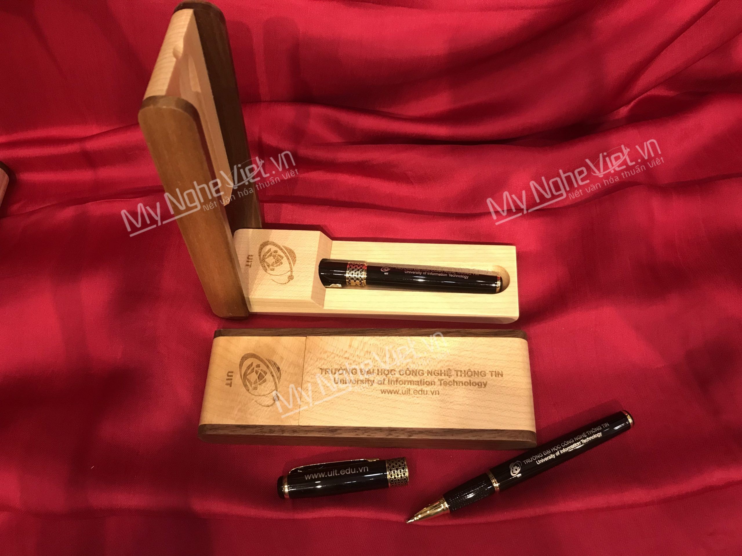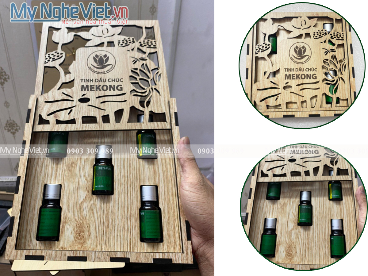 Hộp gỗ có thiết kế tỉ mỉ, đẹp mắt và bền bỉ. Nó có thể được sử dụng để lưu trữ các món đồ như bút, sổ tay hoặc đồ trang sức, giúp giữ cho chúng an toàn và dễ dàng tìm thấy. Sử dụng mút định hình giữ cố định các sản phẩm bên trong an toàn không bị dịch chuyển trong quá trình di chuyển. Hộp có quai xách, kèm thêm các hoa văn cắt có thể thay đổi nhiều mẫu theo yêu cầu: họa tiết lá, hoa sen, số năm thành lập…..