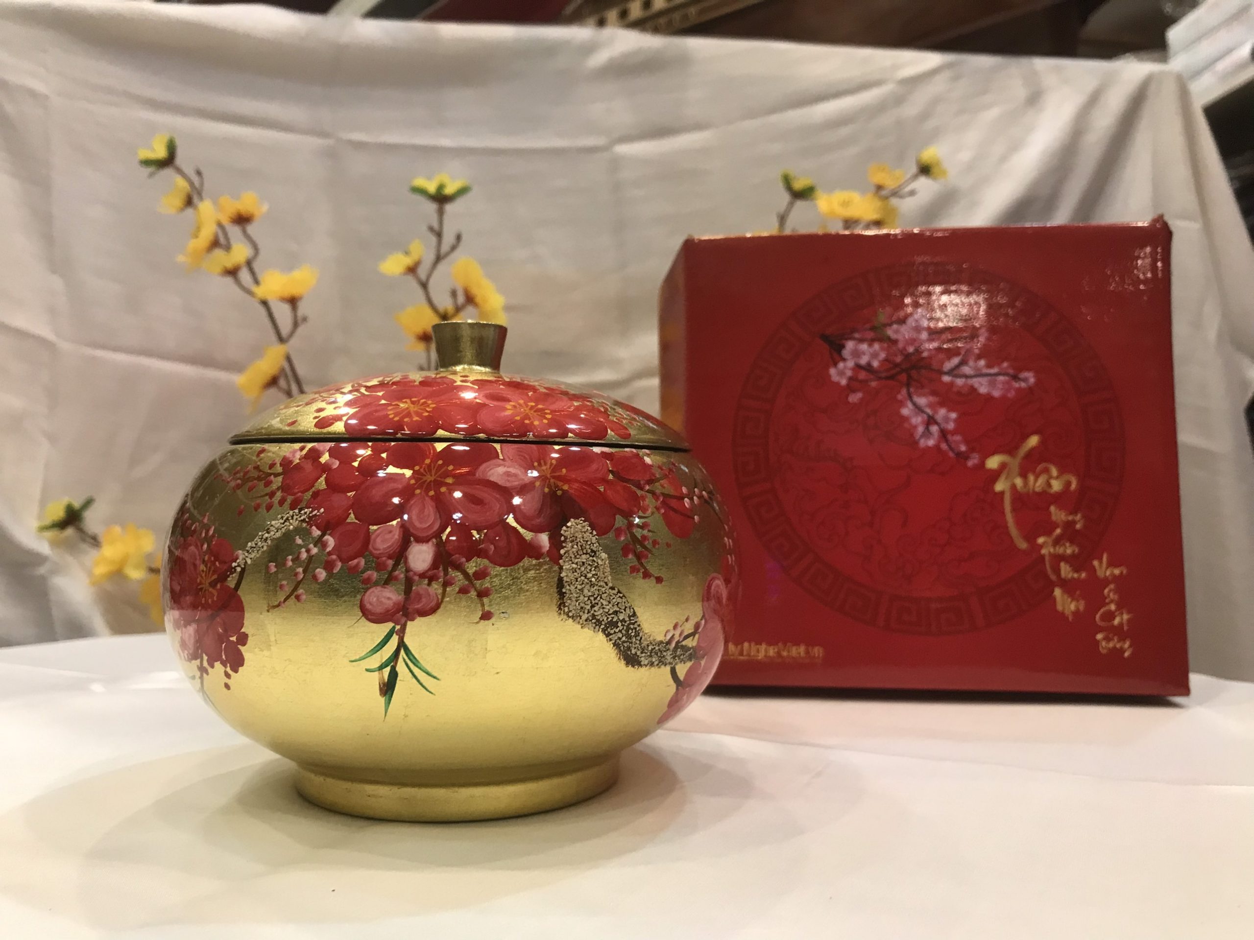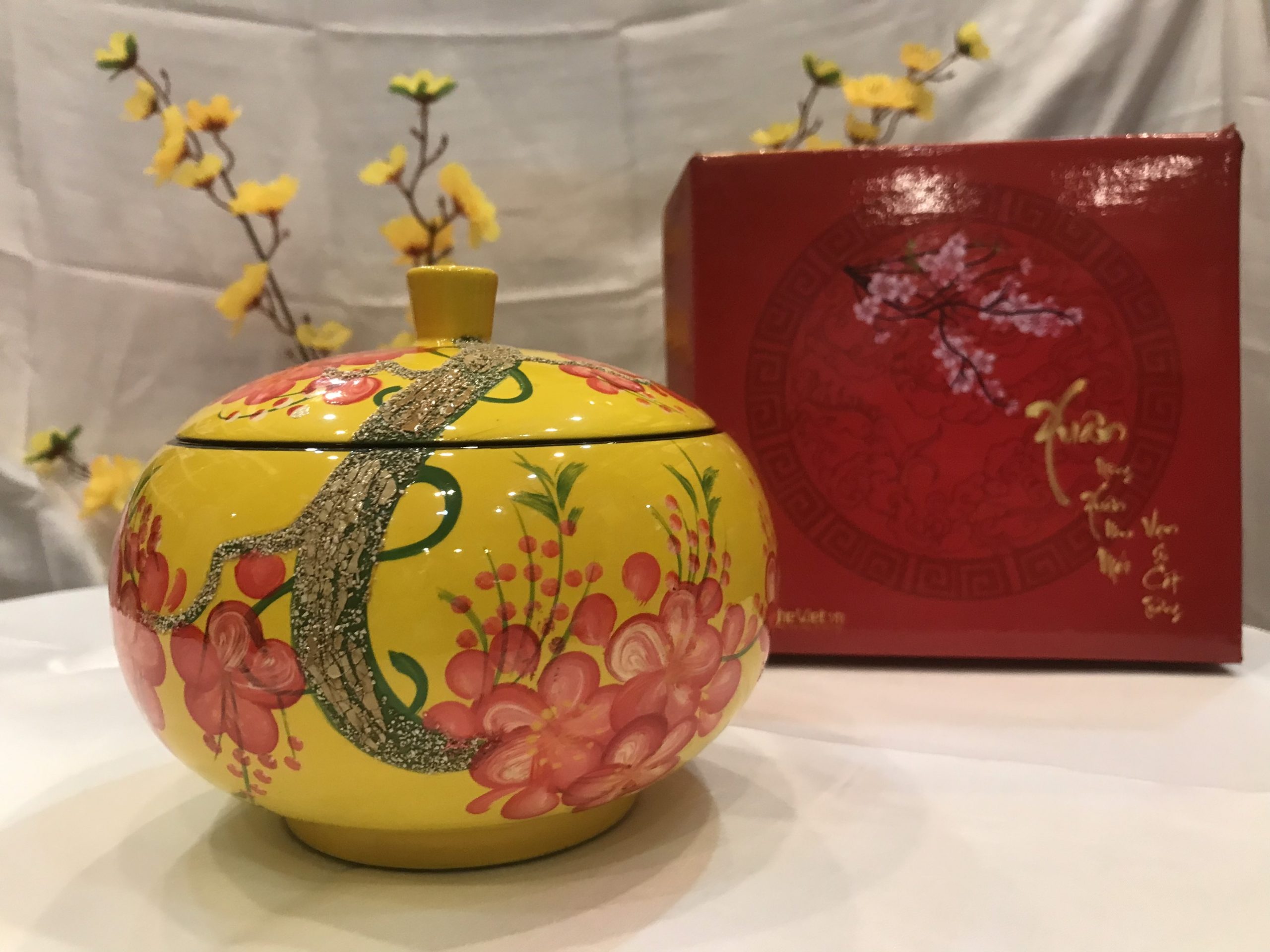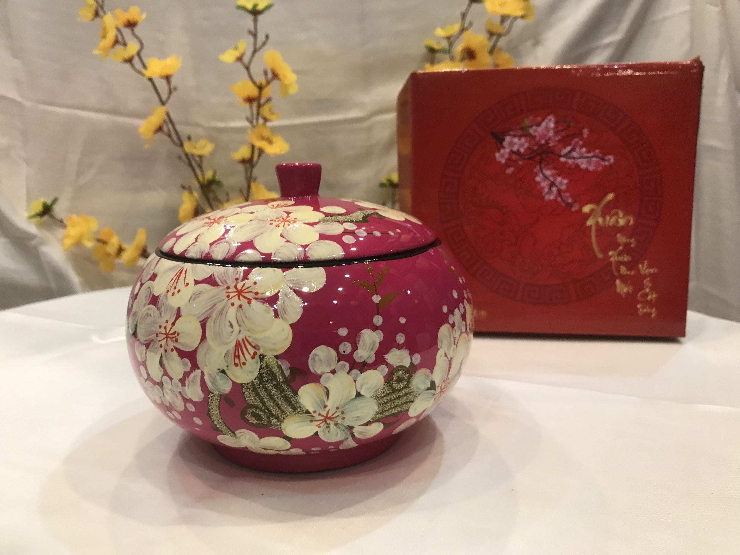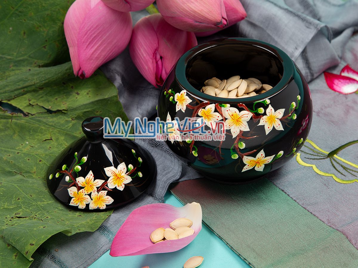 Hũ mận sơn mài không chỉ mang tính nghệ thuật sâu sắc mà còn được dùng làm quà tặng ý nghĩa, thiết thực cho nhân viên, khách hàng mỗi dịp tết đến xuân về. Sản phẩm ngoài công dụng đựng bánh kẹo tiếp khách dịp tết, còn được dùng để trang trí cho không gian phòng khách thêm ấm cúng và sang trọng.