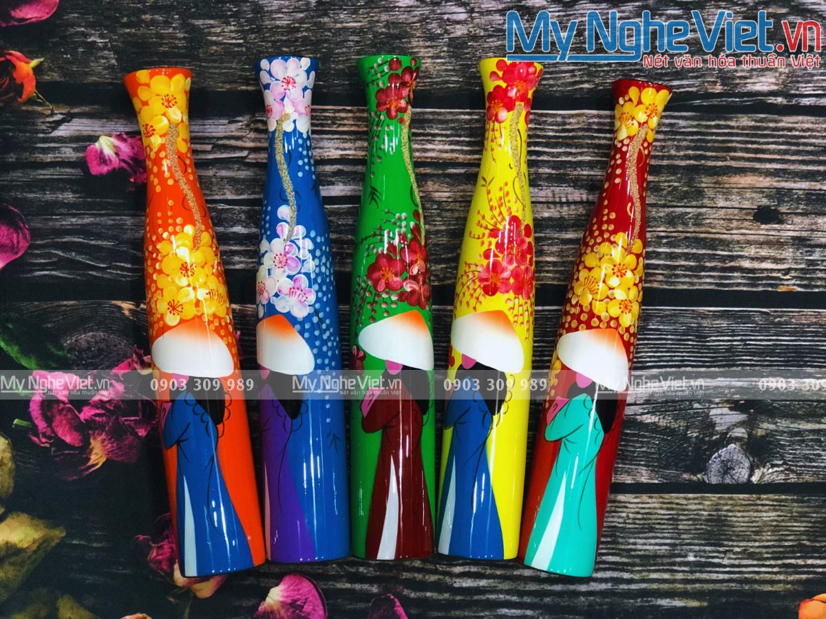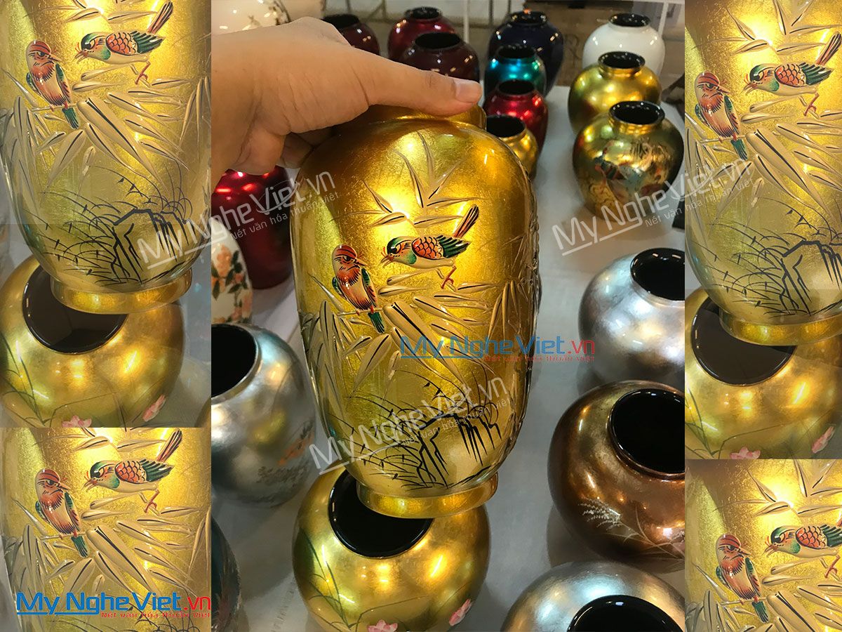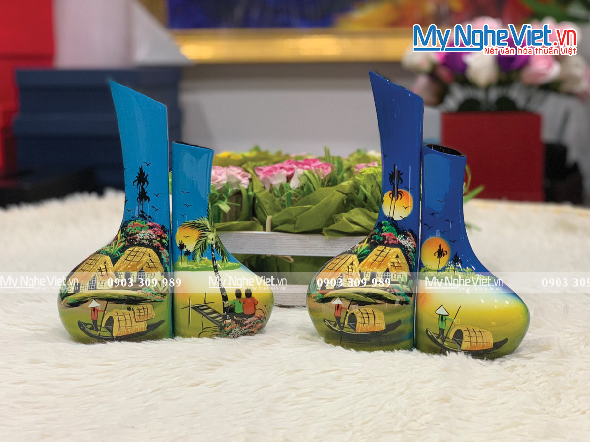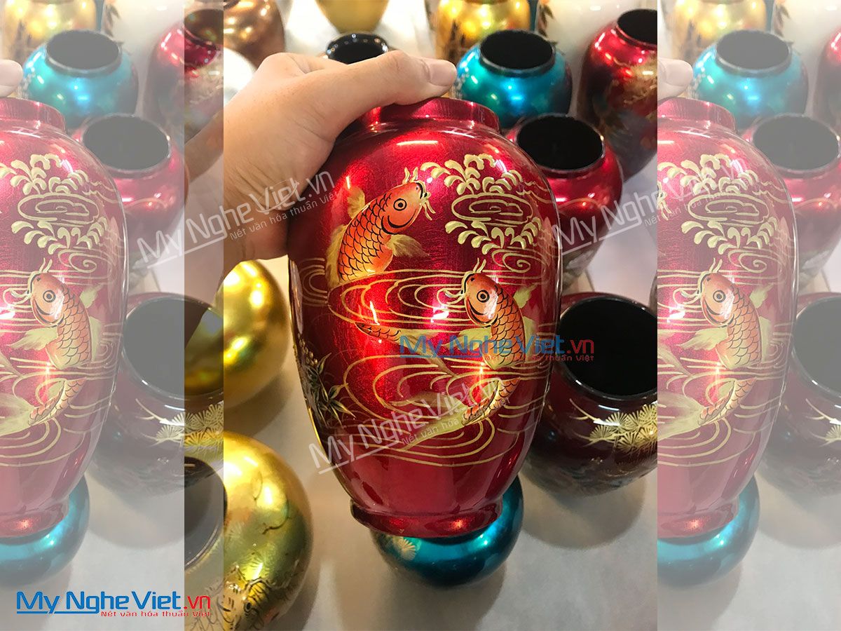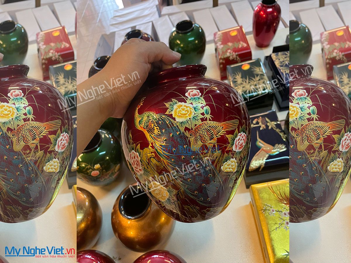 Lọ hoa sơn mài tại Mỹ Nghệ Việt được làm tại làng nghề sơn mài Tương Bình Hiệp (Bình Dương) với lịch sử phát triển hơn 700 năm – nơi được xem là cái nôi của nghệ thuật sơn mài Việt Nam. Chúng có nhiều kiểu dáng, kích thước và hoa văn khác nhau. Các họa tiết trên lọ lấy cảm hứng từ thiên nhiên, văn hóa và con người dân tộc như hoa sen, cá chép, làng quê Việt Nam, rồng, phượng,…