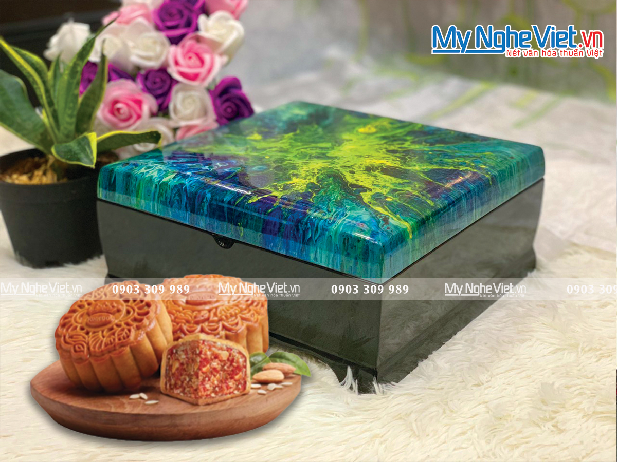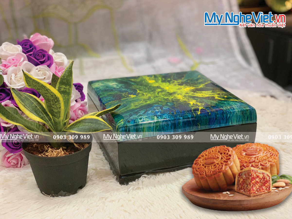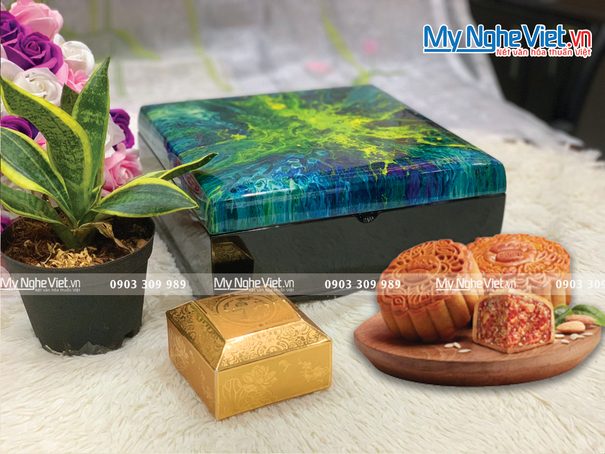 Hộp sơn mài bánh trung thu vân đá xanh vàng