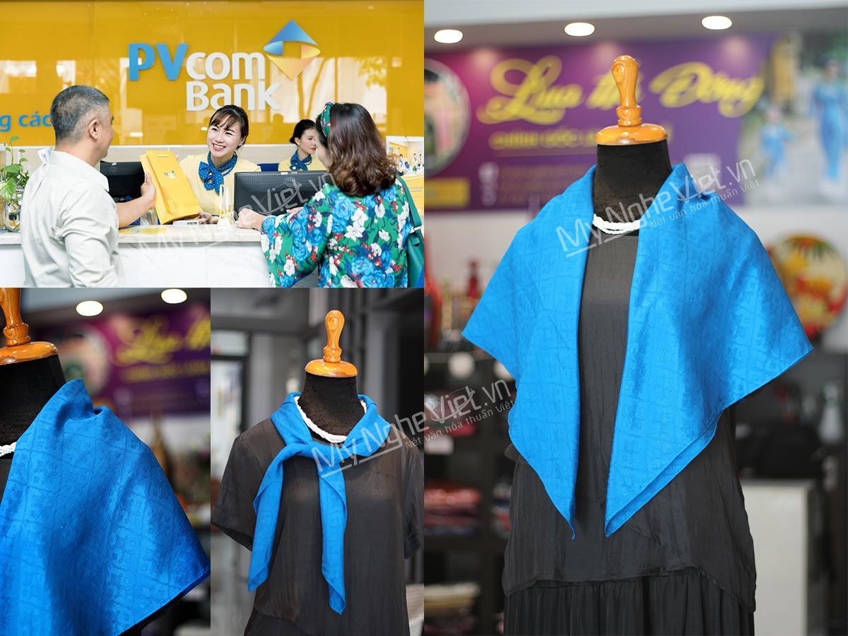 Để tạo điểm nhấn cho bộ đồng một số doanh nghiệp lựa chọn khăn choàng cổ cho các nhân viên nữ. Tạo nên sự dịu dàng và rất dễ thương cho các đồng nghiệp nữ. Đem đến cho khách hàng sự thoải mái khi tiếp xúc. Ví dụ, các đồng nghiệp nữ ở Eximbank, PVCom Bank với chiếc nơ màu xanh ở cổ tạo nên sự thân thiện và đẳng cấp.