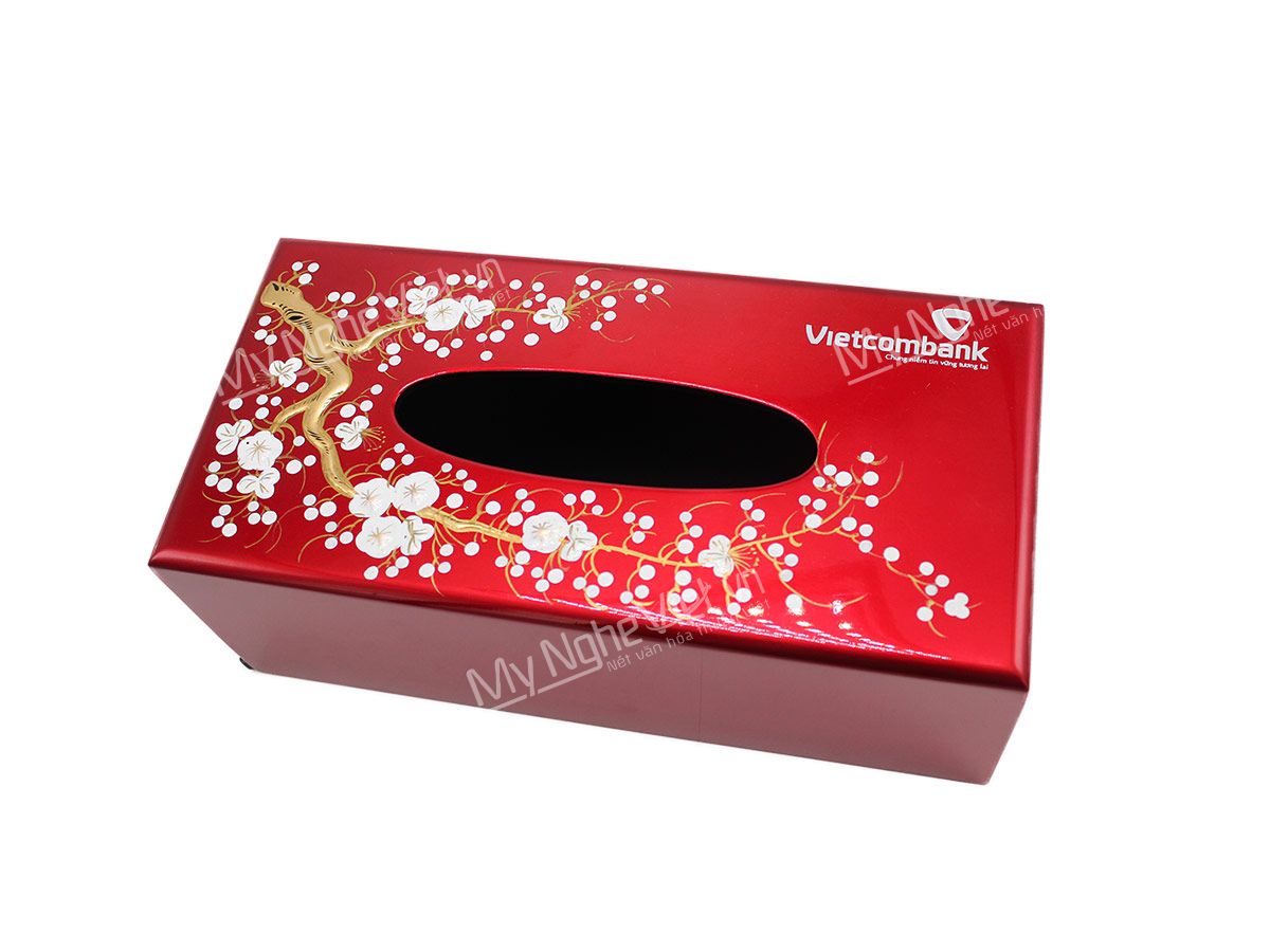Chiếc hộp sơn mài đựng khăn giấy giúp cho phòng khách thêm sang trọng trong ngày Tết. Logo doanh nghiệp cũng thể hiện thương hiệu của công ty mà nhân viên đang làm việc.