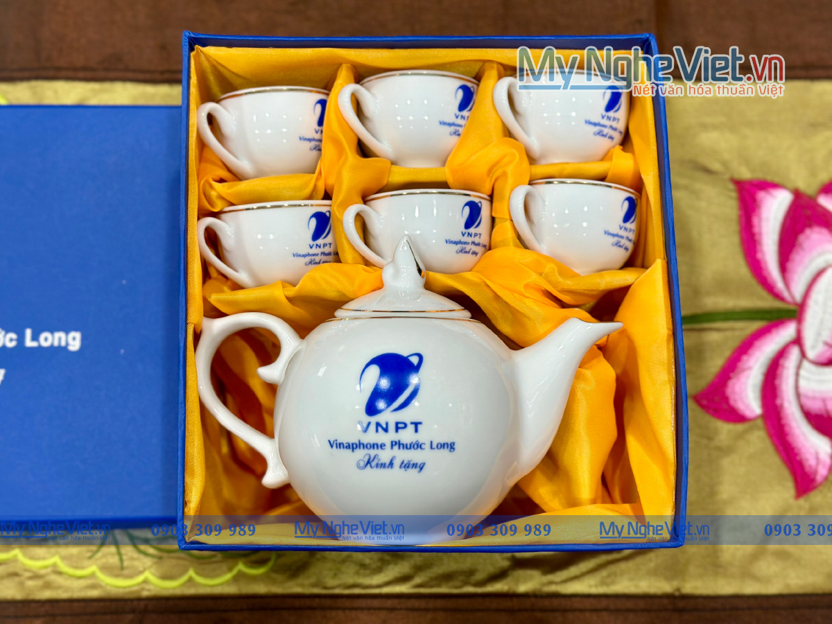 Ấm chén in logo – bình trà ngọn đuốc chỉ vàng kim in logo Vinaphone MNV-BT/LG02
