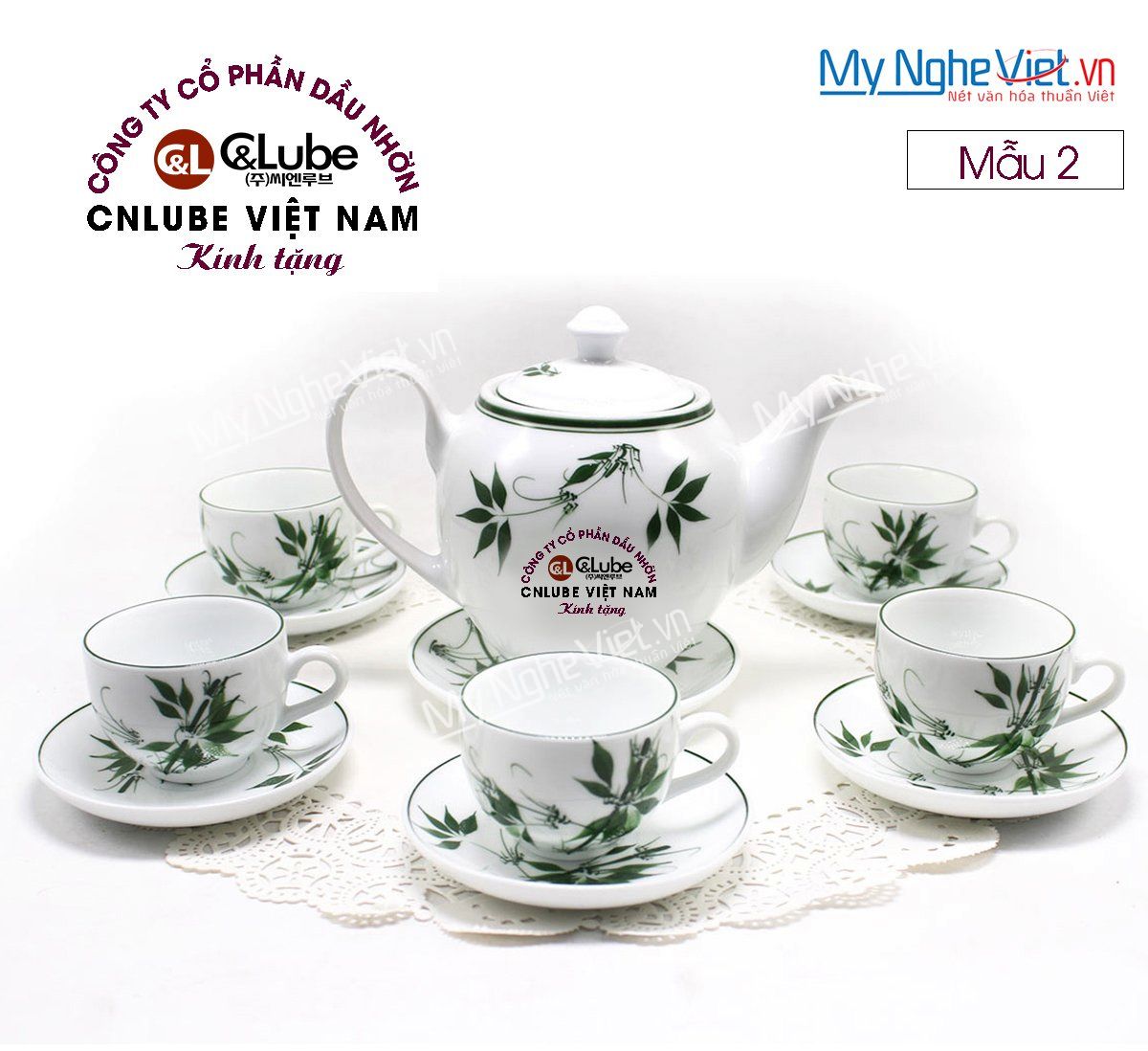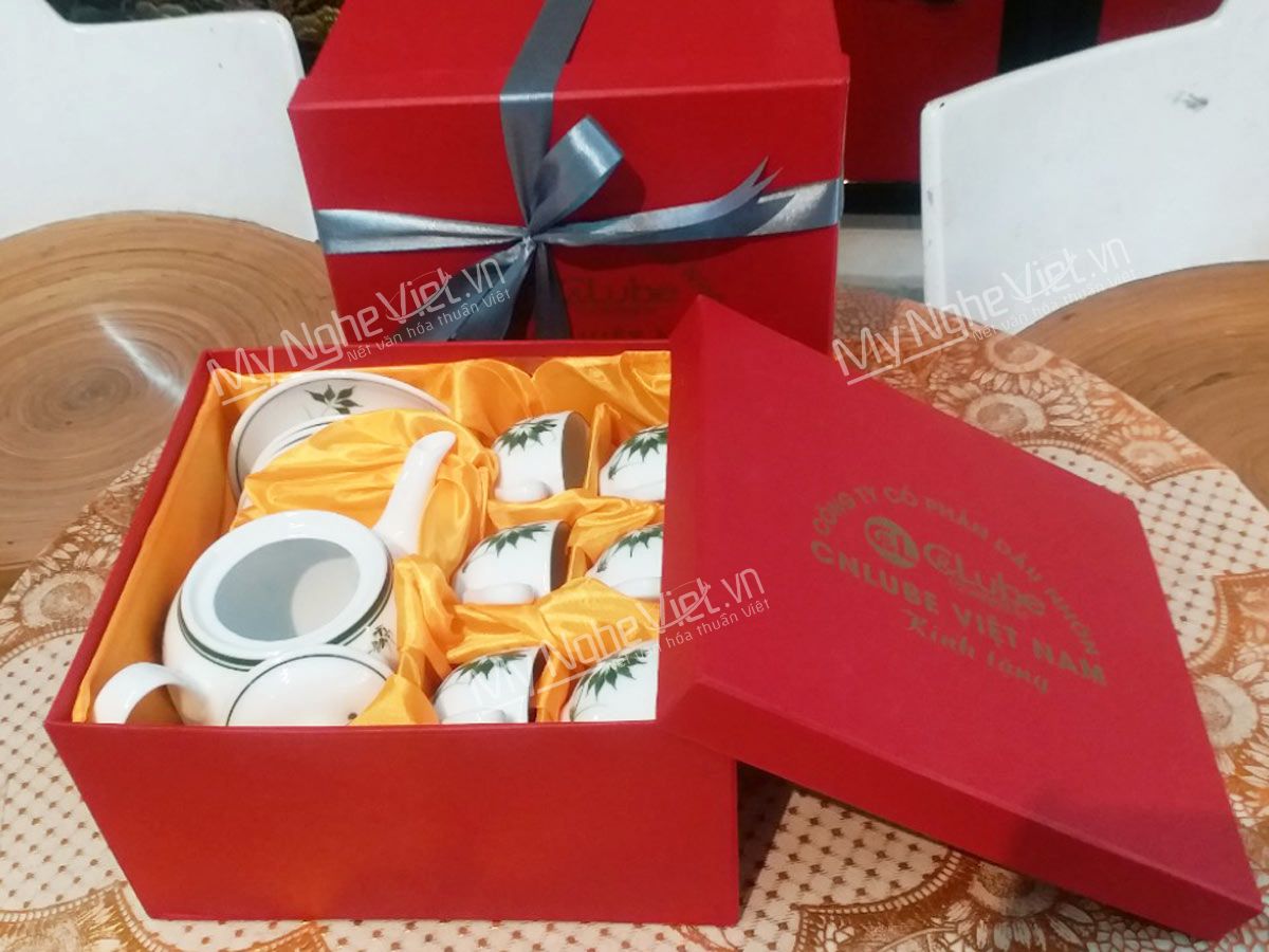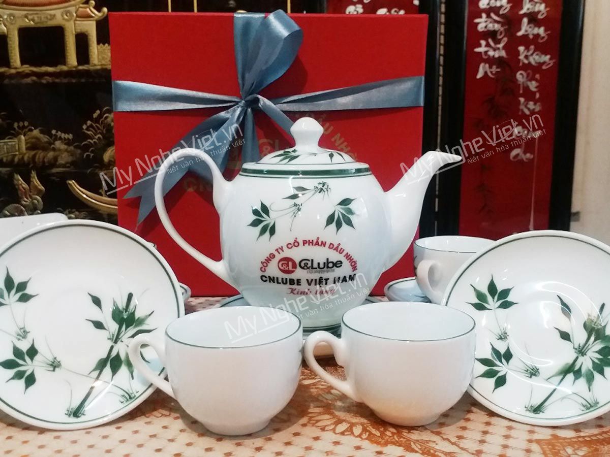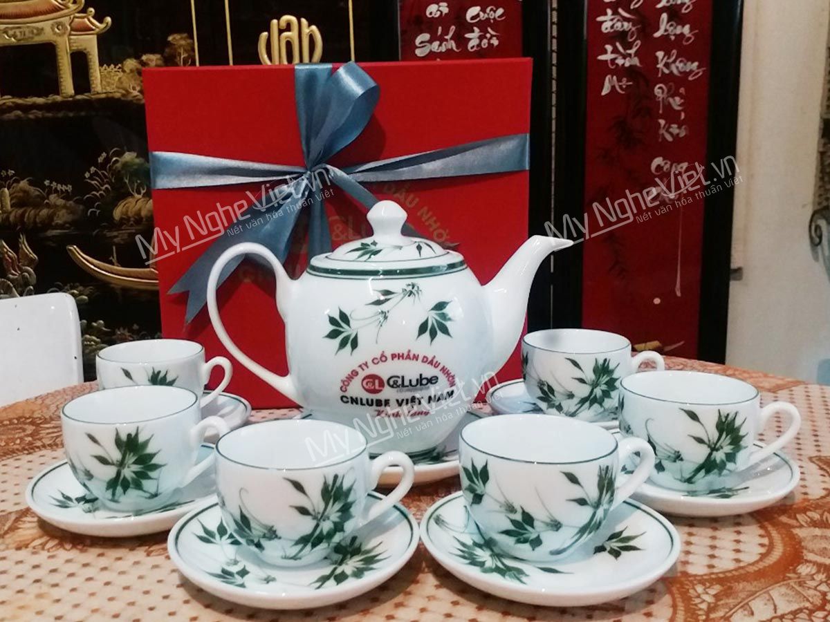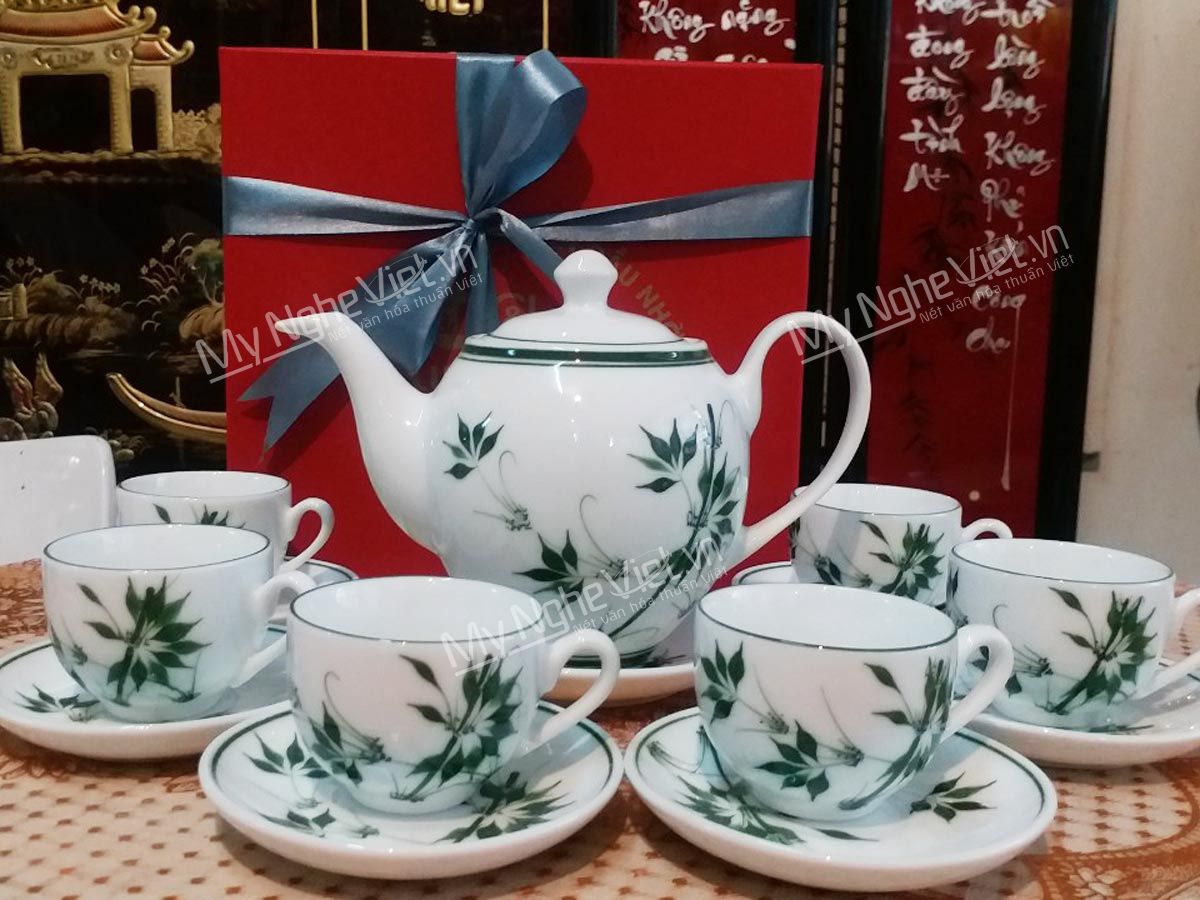 Bình trà Bát Tràng men trắng vẽ đào xanh + Hũ trà MNV-HBT1223/3