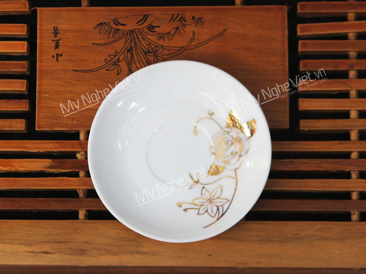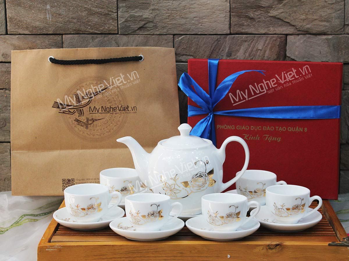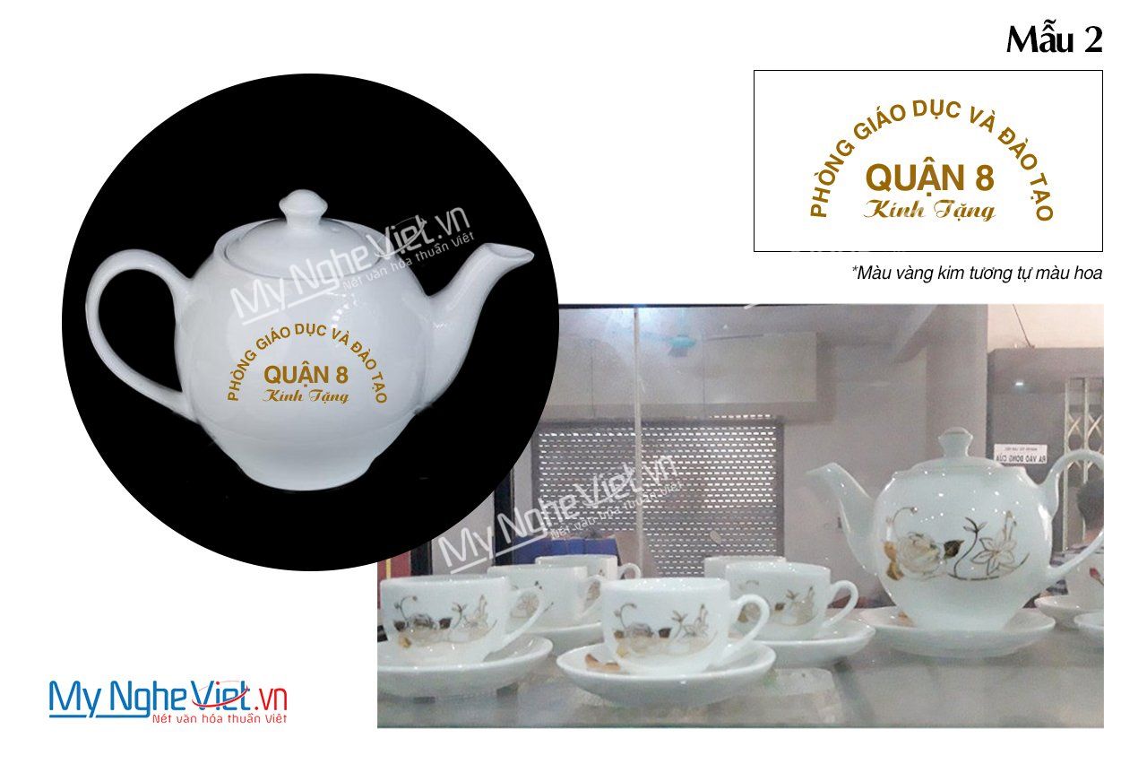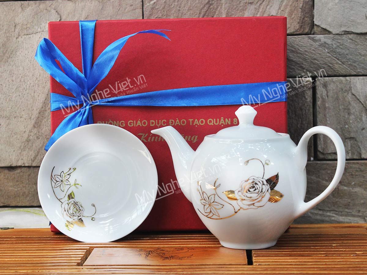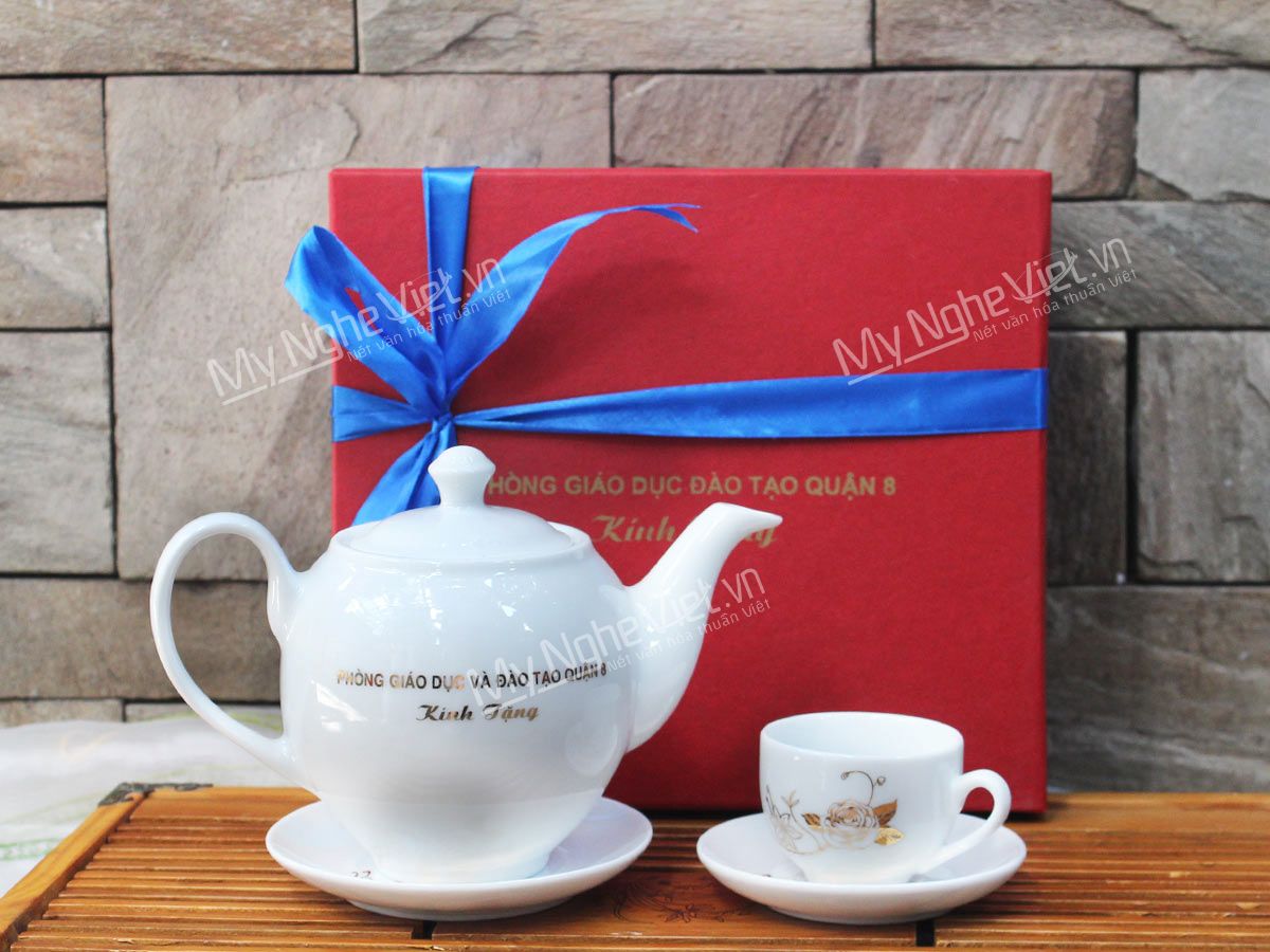 Bình trà in logo viền chỉ vàng kim Phòng Giáo Dục và Đào Tạo Quận 8 họa tiết hoa hồng. Bình trà ( ấm chén) được dát vàng tỉ mỉ từng họa tiết, từng công đoạn của làng nghề thủ công Bát Tràng đem đến sản phẩm không thể nào đẹp hơn.