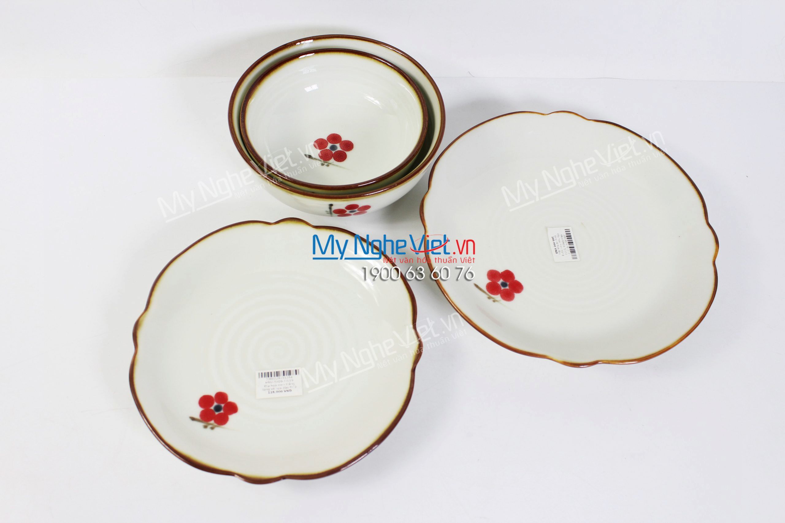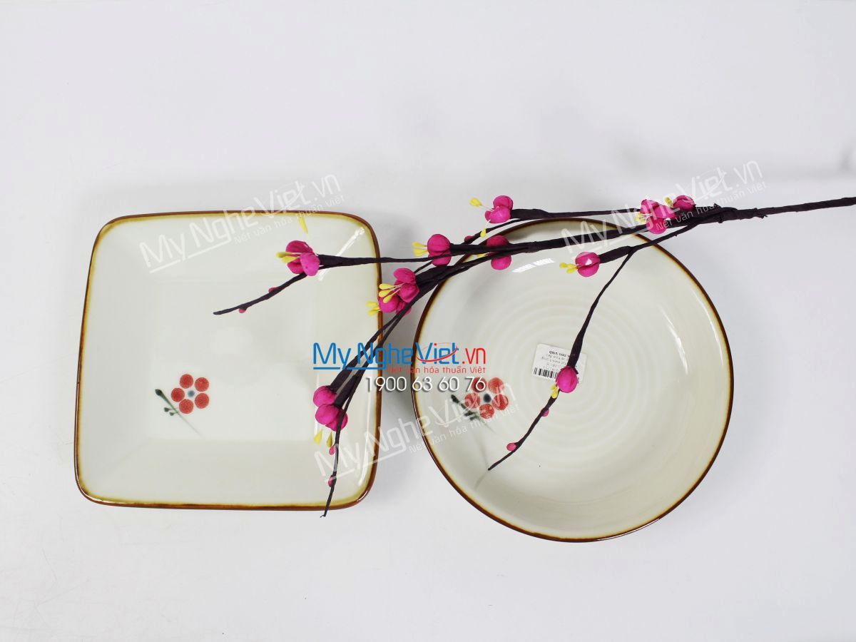 Bộ Bàn Ăn Nhà Hàng Men Kem Vẽ Hoa Đào Đỏ