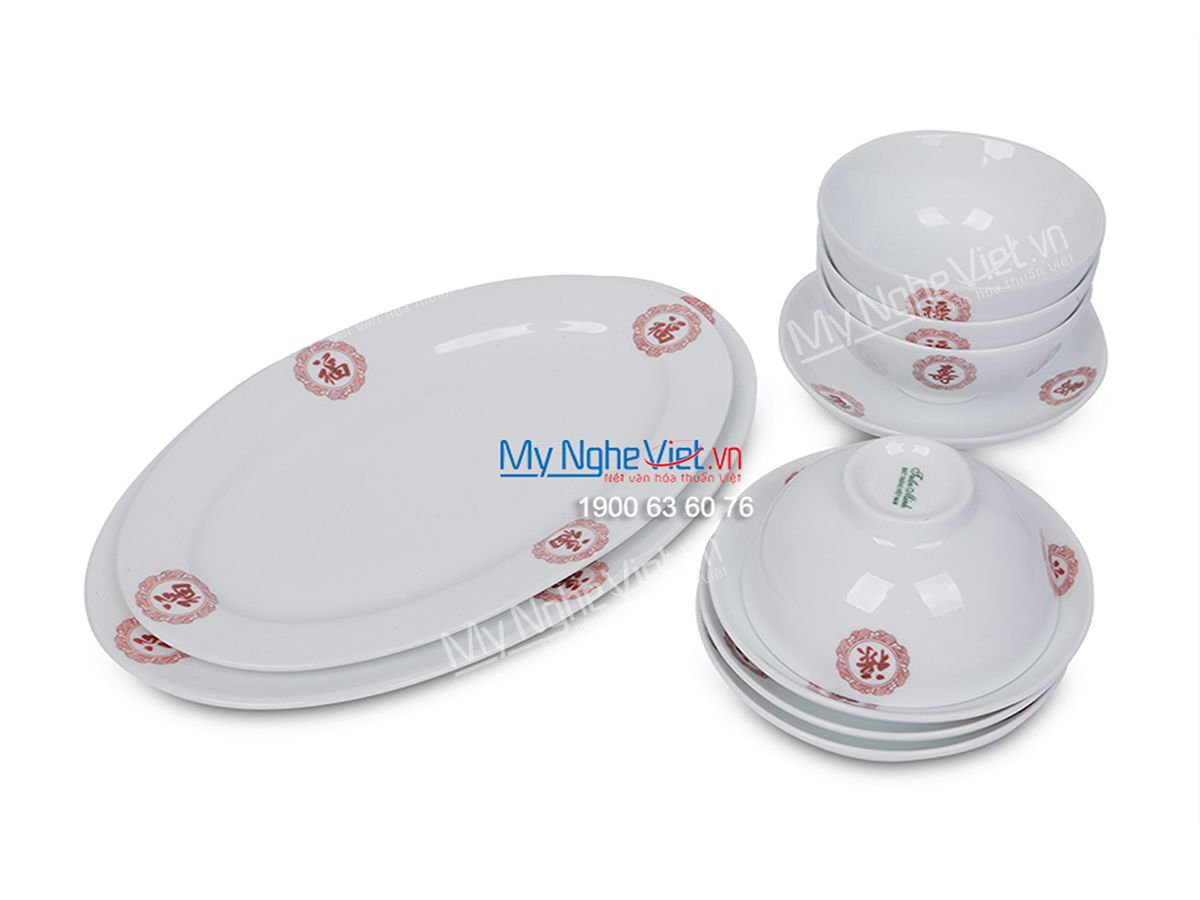 Bộ Bàn Ăn men trắng nổi bật với chữ Phúc Lộc Thọ, mang lại nét cổ điển, chân chất, là bộ chén bát quen thuộc trong mỗi gia đình Việt Nam thời xưa, sản phẩm thích hợp với các nhà hàng cơm quê, mang nét phá cách không chỉ là chén cơm bằng đất viền xanh đại trà như những nhà hàng khác. Mang lại sự mới lạ độc đáo nhưng vẫn giữ trọn nét xưa cũ.