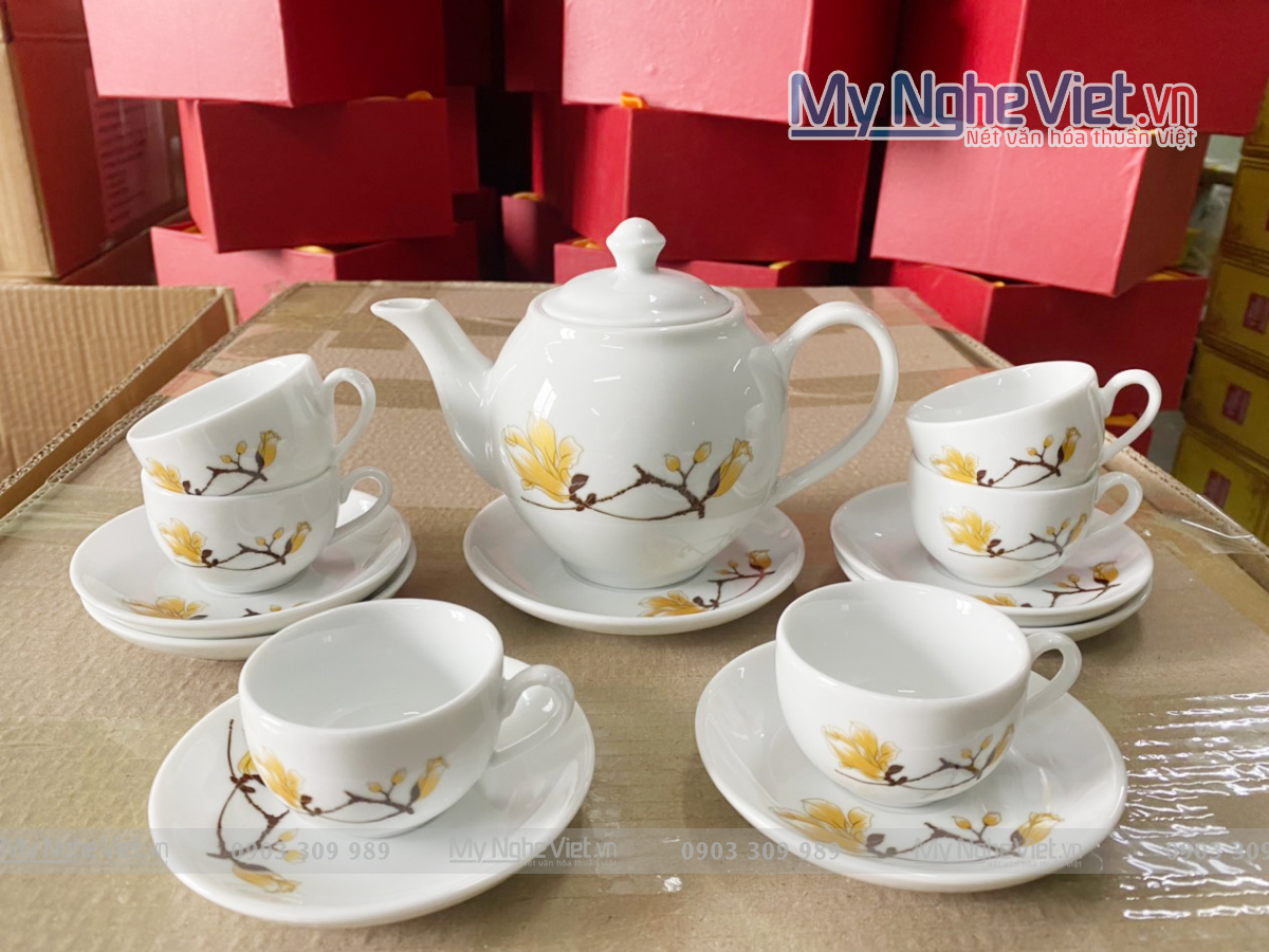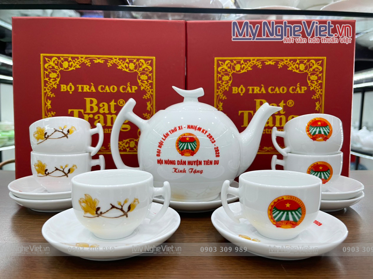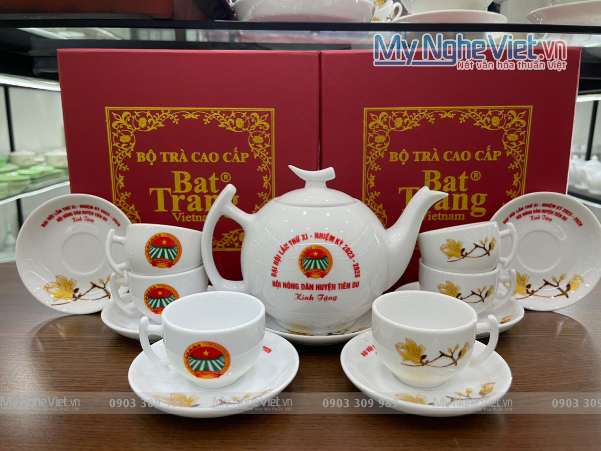 Bộ Bình trà dáng bưởi cành họa tiết hoa mộc lan in logo Đại Hội Lần Thứ XI – Nhiệm kỳ 2023-2028