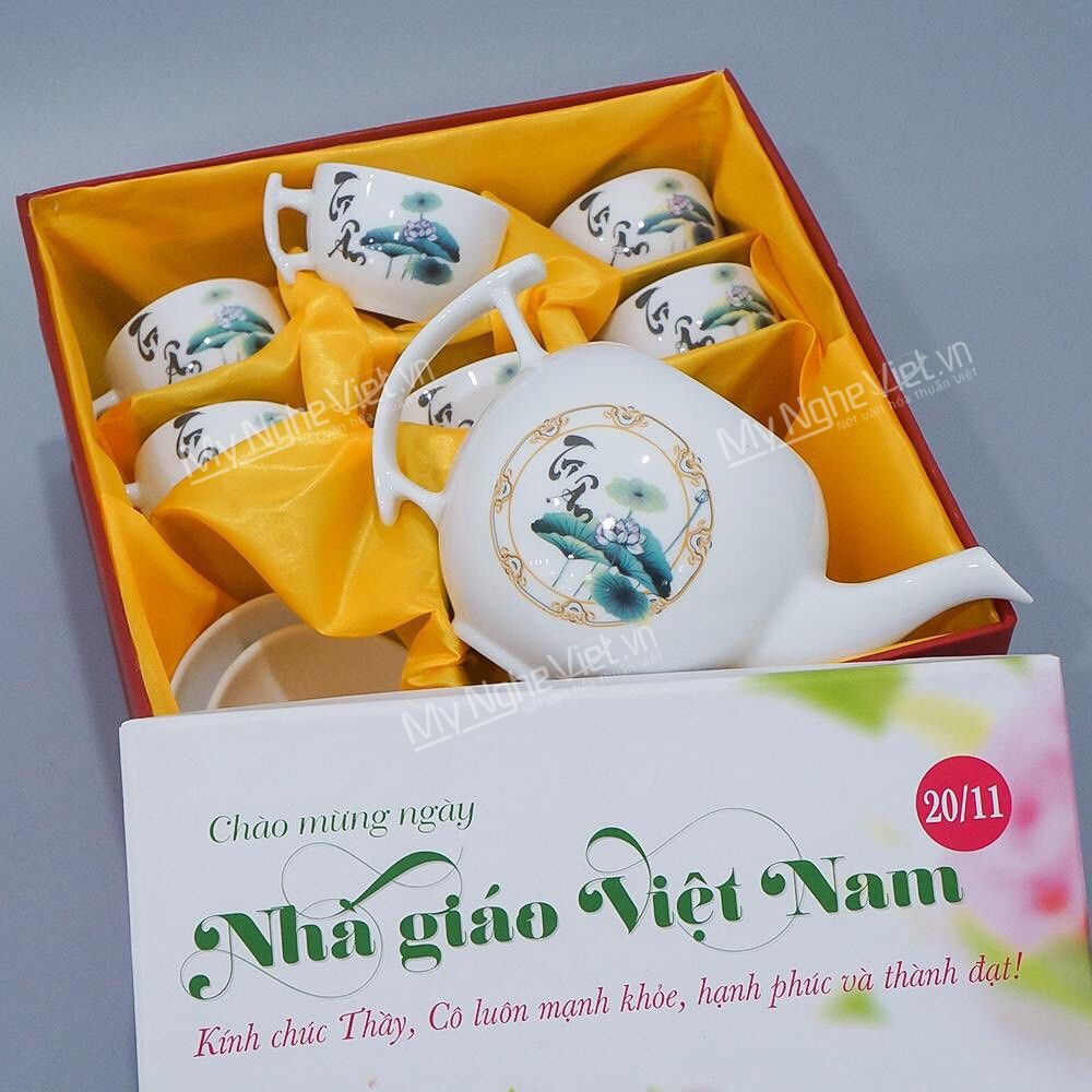 Bình trà Bát Tràng men trắng vẽ đào xanh + Hũ trà MNV-HBT1223/3