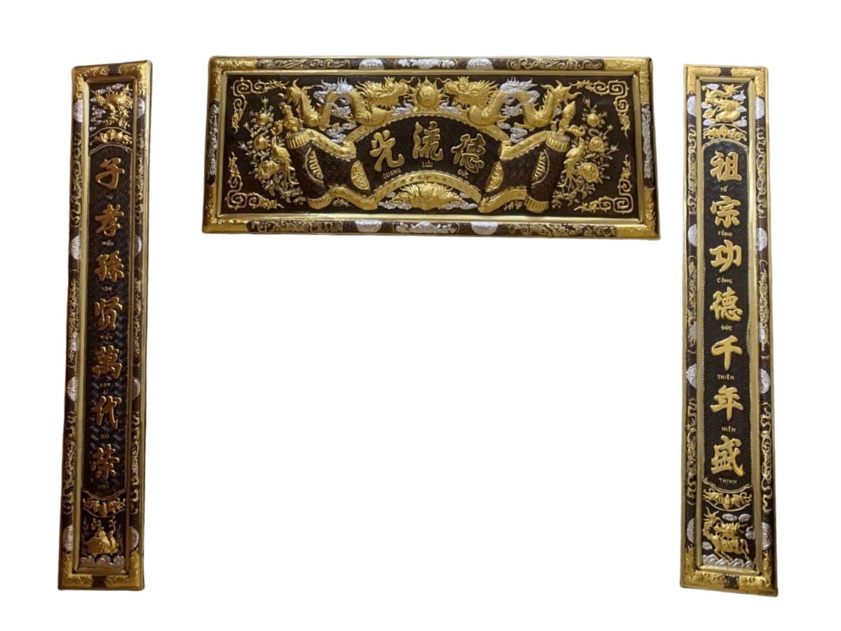 - Chất liệu: Đồng vàng, tương tự hoành phi. Nền: Sơn son đen (hoặc màu tối).