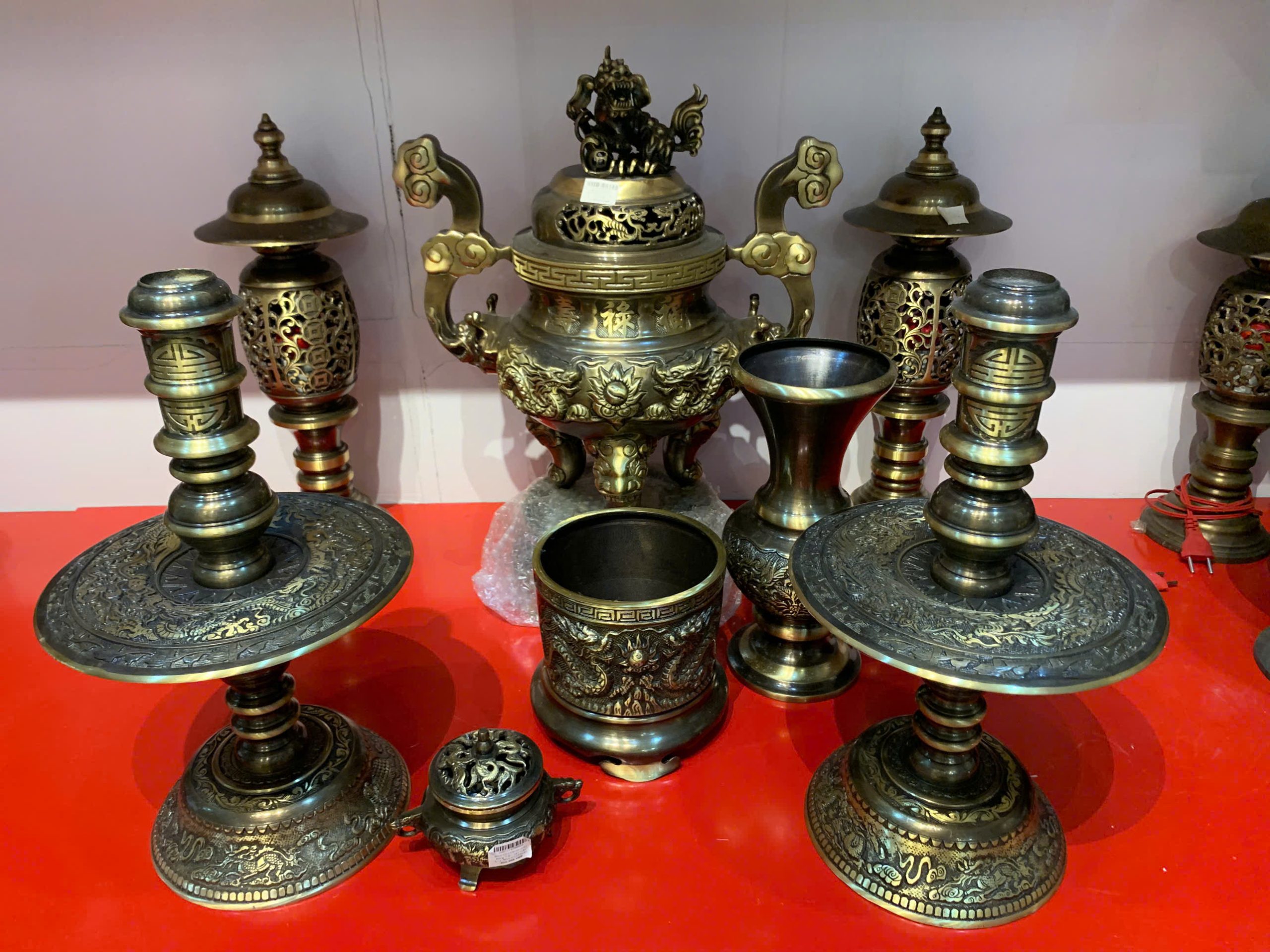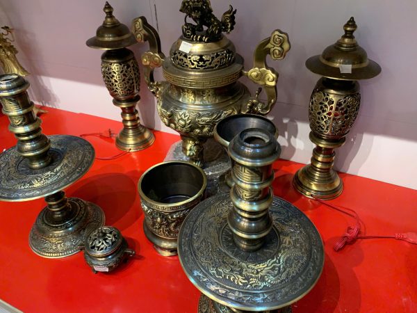 • Bộ sản phẩm bao gồm: 1 đỉnh đồng, 2 chân nến, 2 đèn đồng, 1 bát hương, 1 lọ hoa, 1 lọ trầm hương