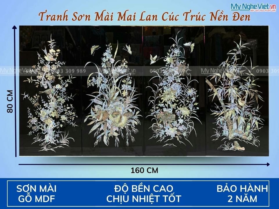 Bộ tranh với kích thước 80 x 160 (cm), mỗi chi tiết được cẩn nổi phù hợp treo ở các không gian như phòng khách, phòng làm việc, phong ngủ…