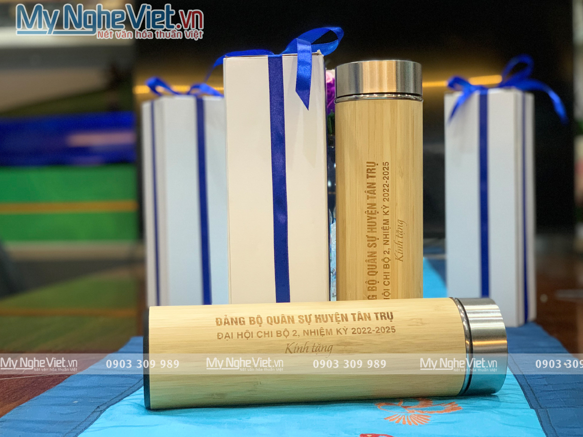 Một trong những thành phần quan trọng trong combo quà tặng gỗ là bình giữ nhiệt. Bình giữ nhiệt bằng tre không chỉ giữ được nhiệt độ của đồ uống lâu hơn mà còn tạo cảm giác ấm cúng và tự nhiên nhờ vẻ đẹp của chất liệu gỗ. Đây là một món quà tuyệt vời cho những người thường xuyên di chuyển, làm việc văn phòng hoặc yêu thích uống nước nóng. Được làm từ chất liệu inox 304 an toàn sức khỏe cho người tiêu dùng, kế đến được thiết kế có thể khắc lazer nhiều thông tin trên bình theo yêu cầu được.
