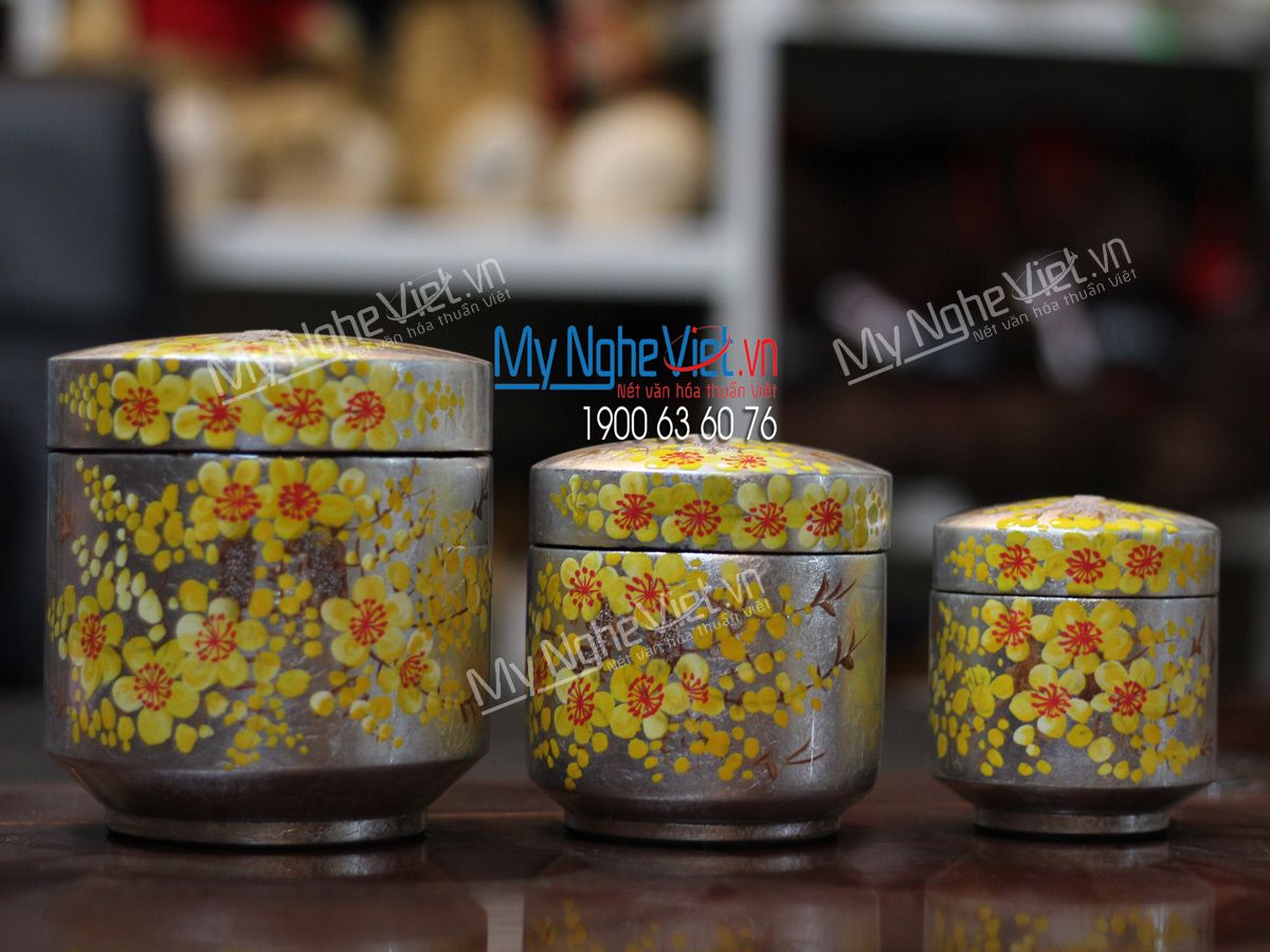Bộ sản phẩm hộp mứt tết sơn mài vẽ hoa mai thích hợp đựng các loại kẹo, mứt và các vật dụng khác, điểm sắc thêm cho phòng khách gia đình ngày tết.