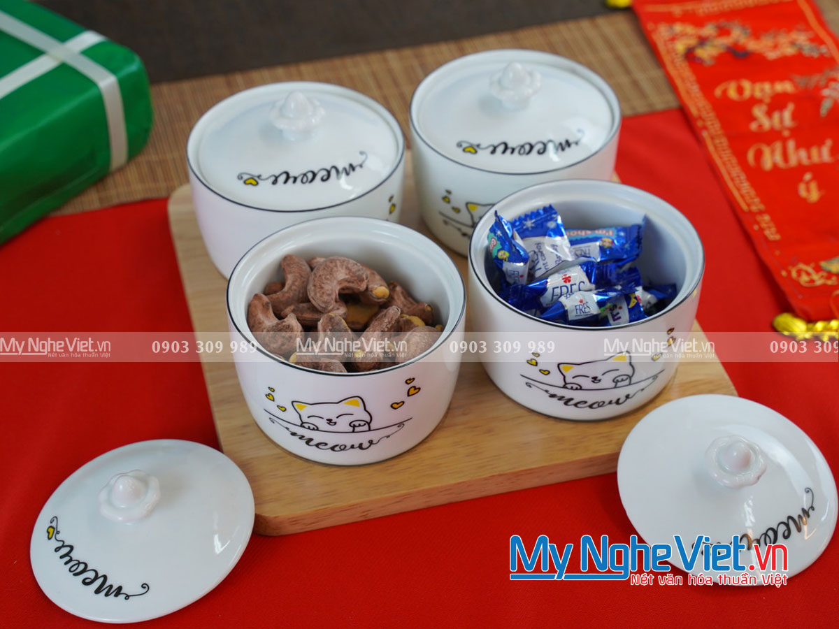 Khay mứt 4 ngăn vẽ hoa mai- đào – mèo con xinh xắn
